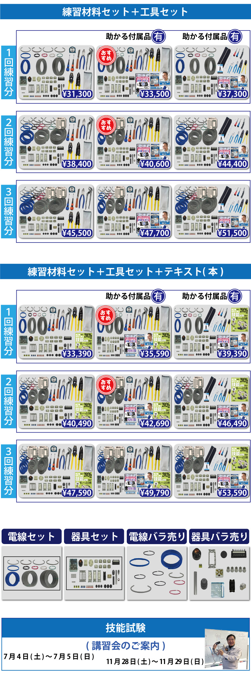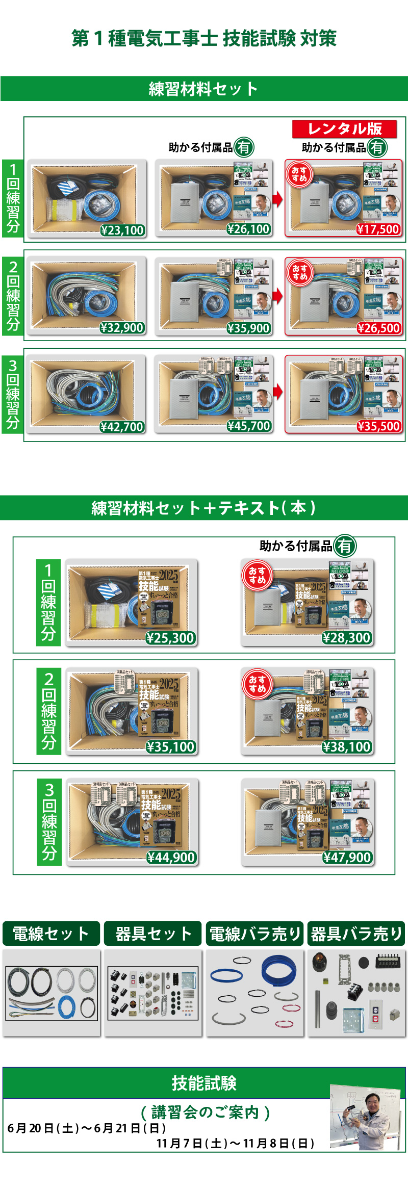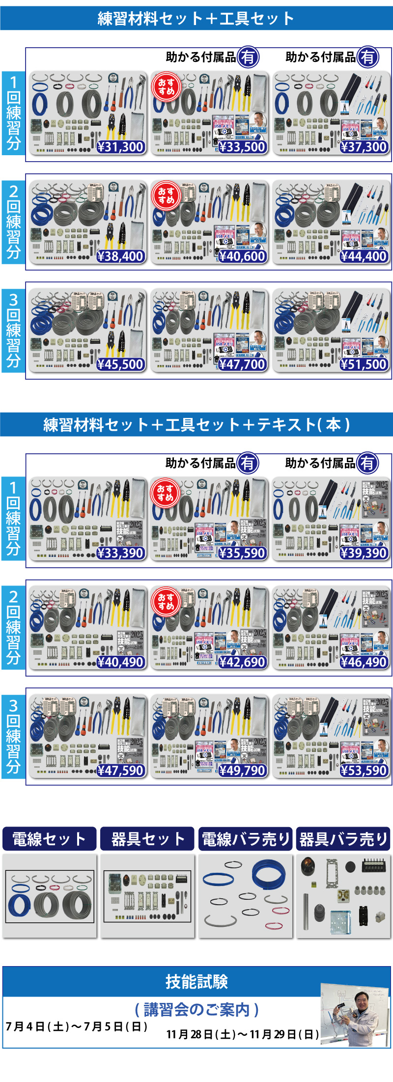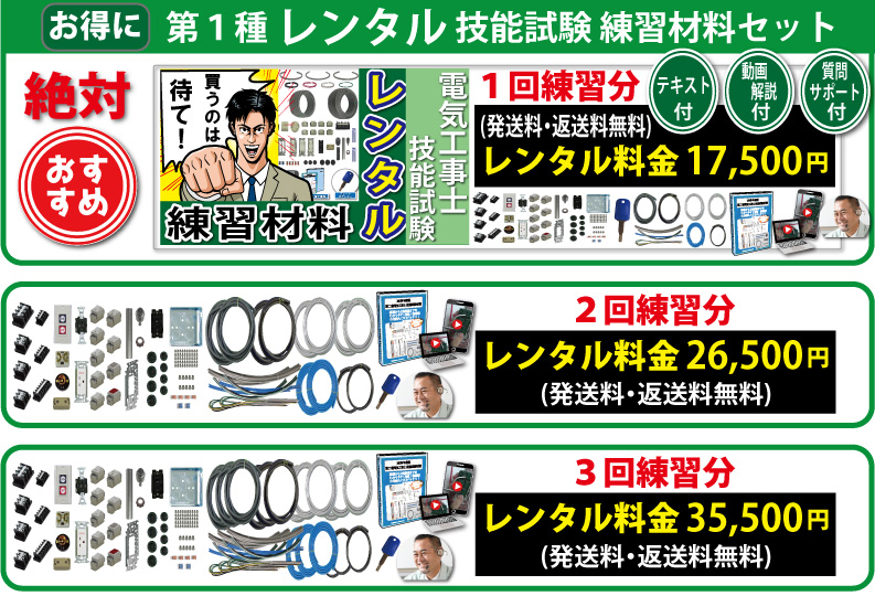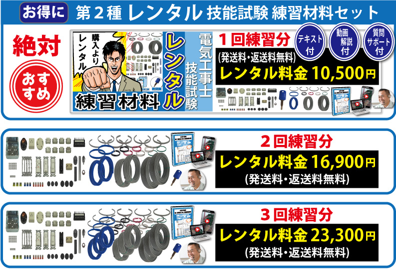 責任者の遠藤です。技能試験を受験するにあたって大変なのが練習する上での材料調達です。当社では電気技術者試験センターより公表されている電気工事士技能試験候補問題の練習ができるように電線から器具、工具、対策解説書にいたるまですべて調達できます。
