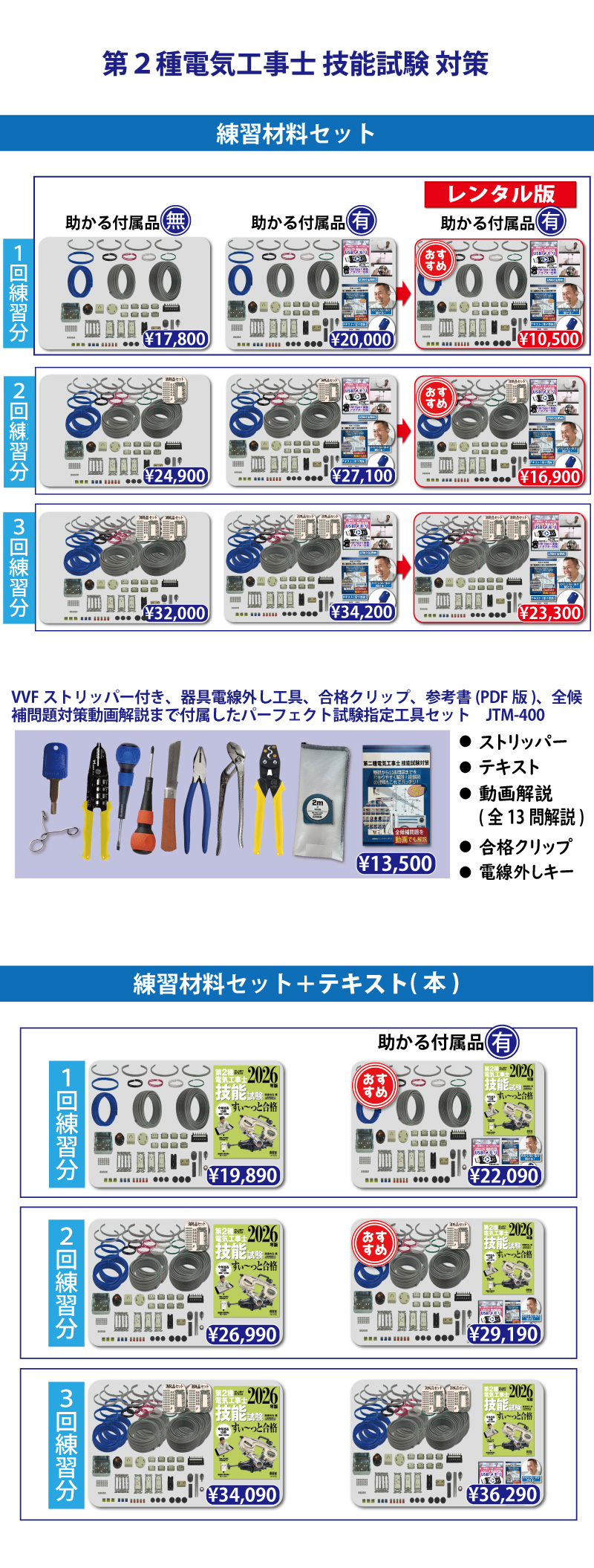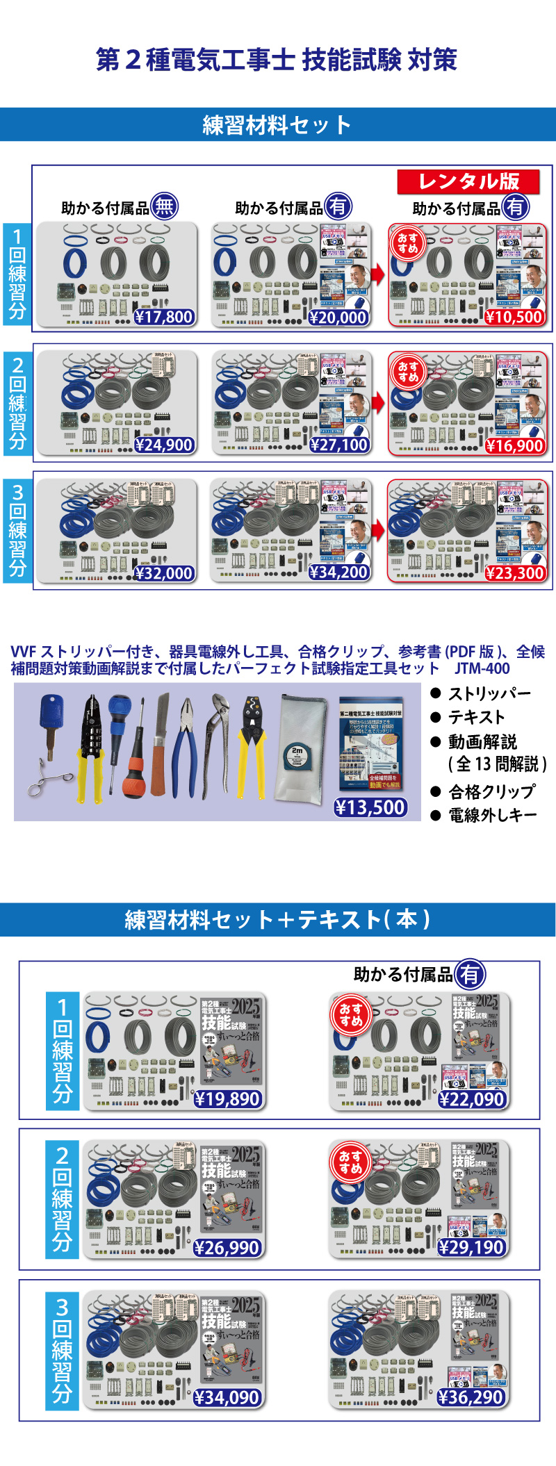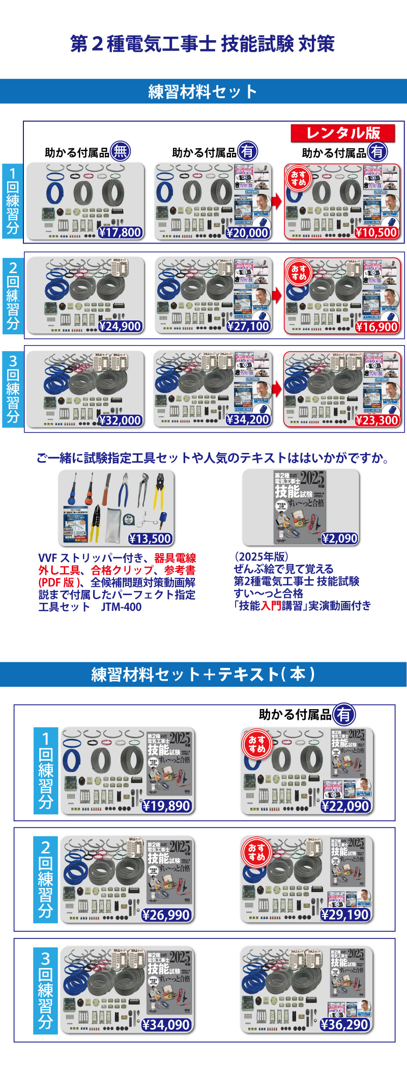 責任者の遠藤です。技能試験を受験するにあたって大変なのが練習する上での材料調達です。当社では電気技術者試験センターより公表されている電気工事士技能試験候補問題の練習ができるように電線から器具、工具、対策解説書にいたるまですべて調達できます。