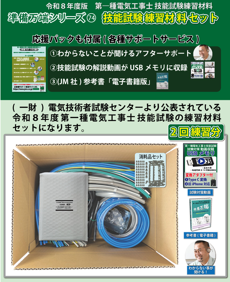 | 製品名 | 第1種電気工事士 技能試験練習材料セット 全10問分の器具・電線セット (2回練習分) 助かる付属品 準備万端シリーズ74 |