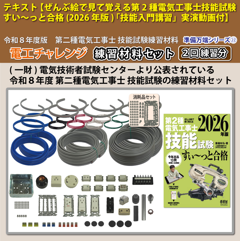 (一財)電気技術者試験センターより公表されている第二種電気工事士技能試験候補問題全13問分を一通り2回分練習できる練習材料セットになります。