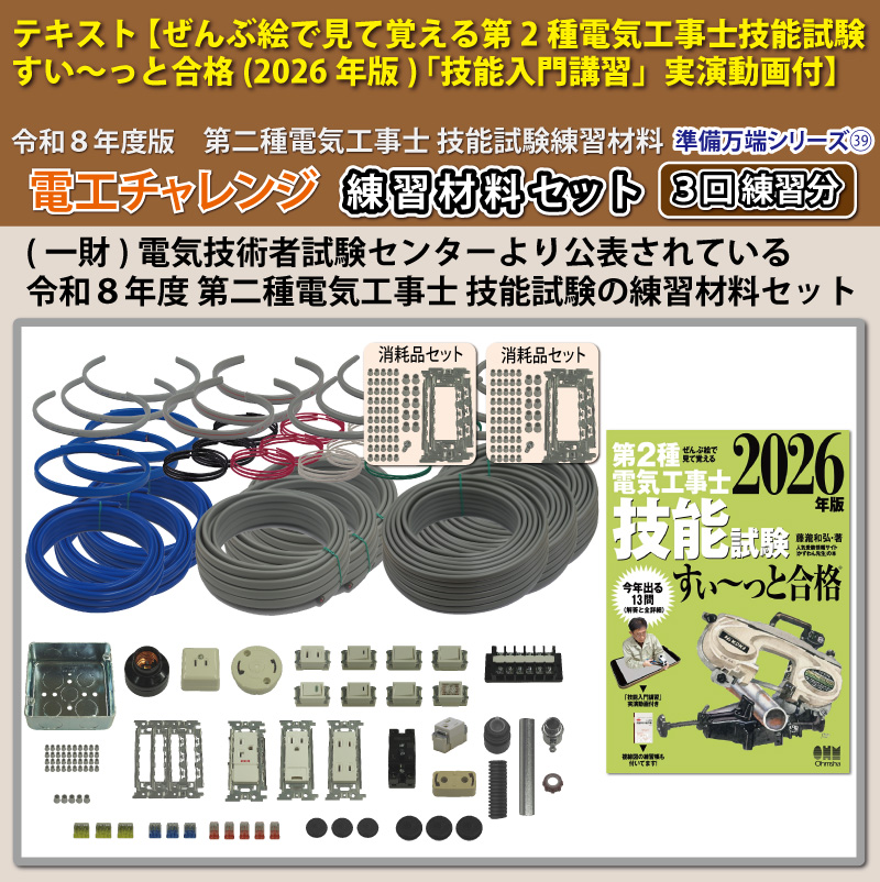 (一財)電気技術者試験センターより公表されている第二種電気工事士技能試験候補問題全13問分を一通り3回分練習できる練習材料セットになります。