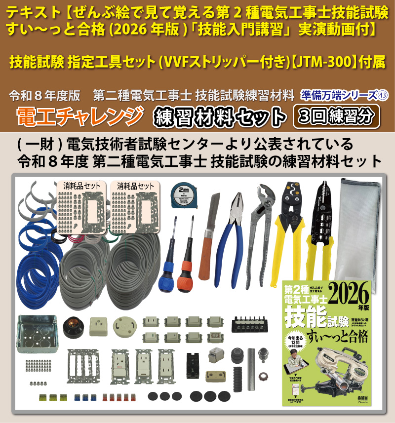 | 製品名 | 第2種電気工事士 技能試験練習材料セット 全13問分の器具・電線セット (3回練習分) テキスト付き 指定工具付き 電工チャレンジ 準備万端シリーズ43 |