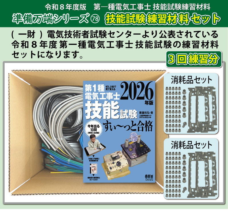 (一財)電気技術者試験センターより公表されている第1種電気工事士技能試験候補問題全10問分を一通り3回分練習できる練習材料セットになります。
