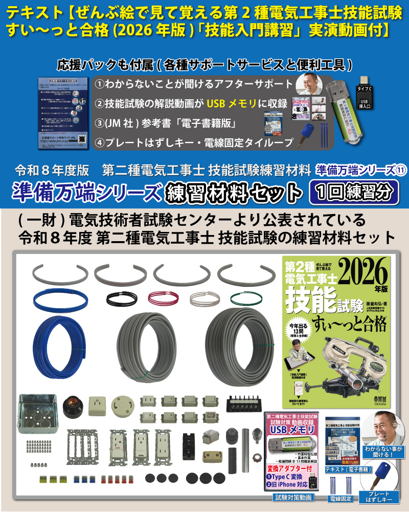 | 製品名 | 第2種電気工事士 技能試験練習材料セット 全13問分の器具・電線セット (1回練習分) テキスト付き 助かる付属品 準備万端シリーズ11 令和8年度版 |