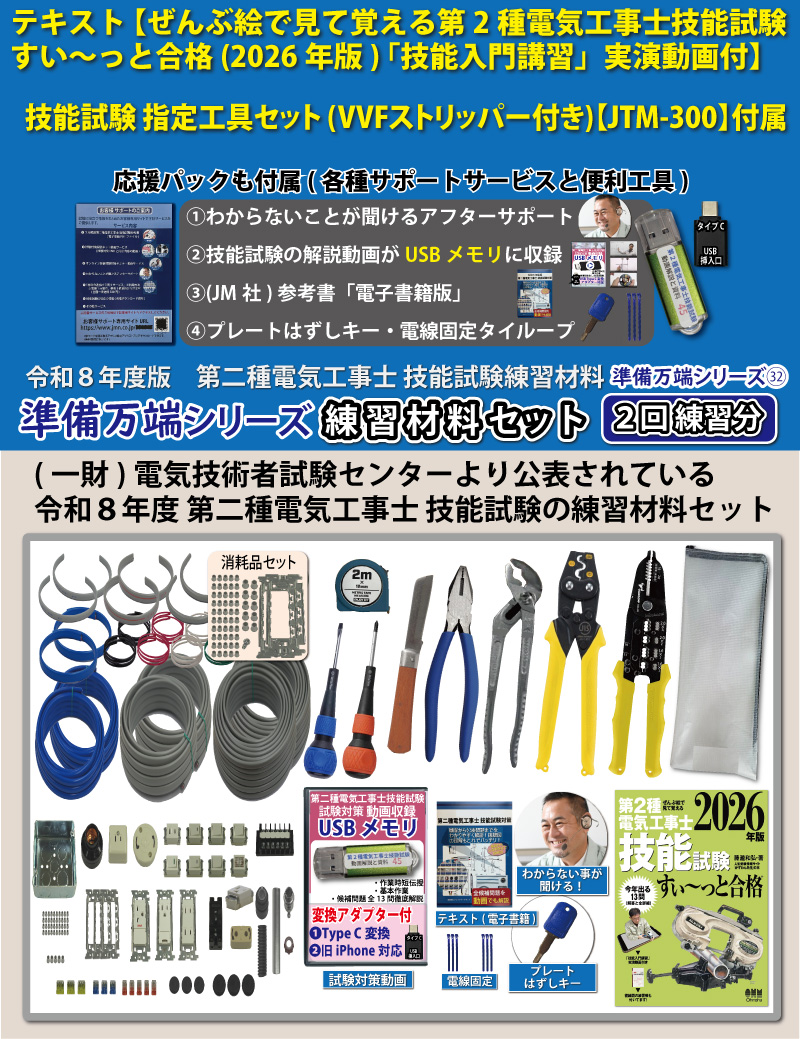 | 製品名 | 第2種電気工事士 技能試験練習材料セット 全13問分の器具・電線セット (2回練習分) テキスト付き 指定工具付き 助かる付属品 準備万端シリーズ32 |