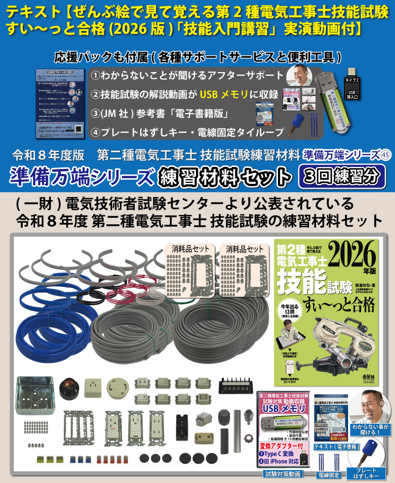 (一財)電気技術者試験センターより公表されている第二種電気工事士技能試験候補問題全13問分を一通り3回分練習できる練習材料セットになります。