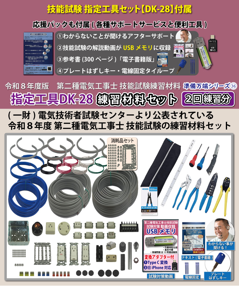 (一財)電気技術者試験センターより公表されている第二種電気工事士技能試験候補問題全13問分を一通り2回分練習できる練習材料セットになります。