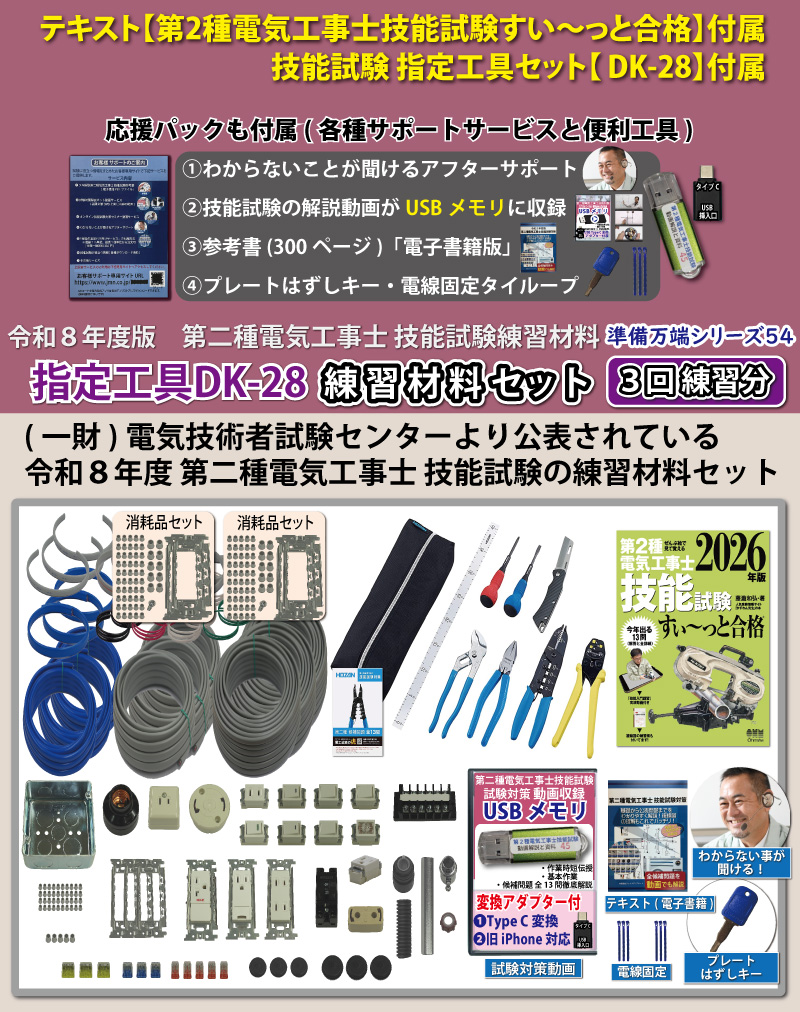 (一財)電気技術者試験センターより公表されている第二種電気工事士技能試験候補問題全13問分を一通り3回分練習できる練習材料セットになります。