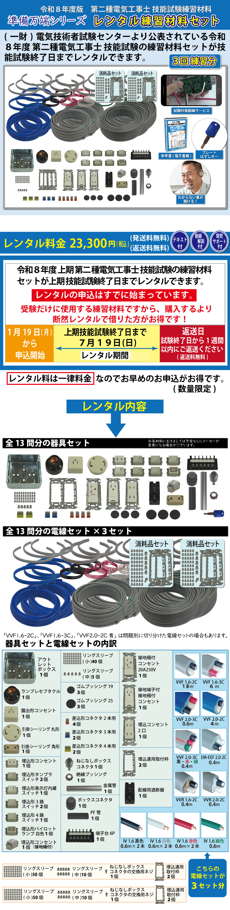 | 製品名 | 【レンタル版】 電気工事士2種 実技 試験セット (3回練習分)令和8年度版【返却日:試験終了後1週間以内にご返送】(発送料・返送料無料) |