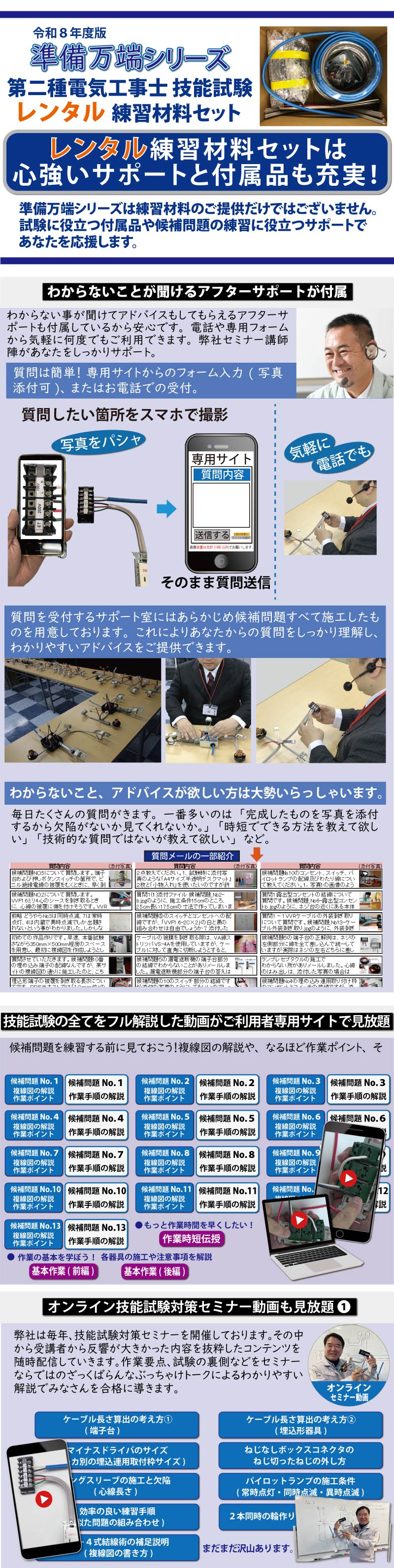 (一財)電気技術者試験センターより公表されている第二種電気工事士技能試験候補問題全13問分を一通り3回分練習できる練習材料をレンタルできます。