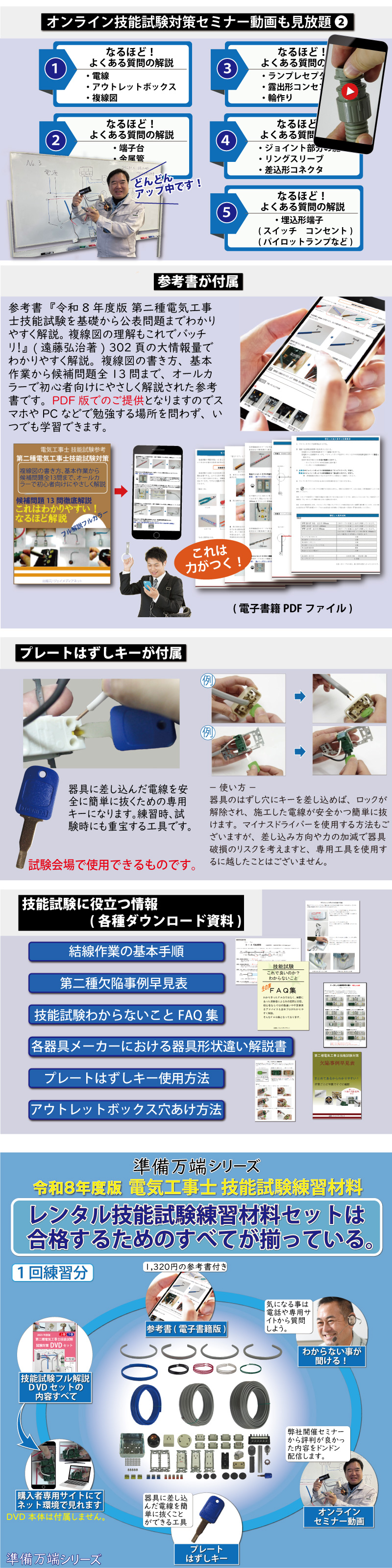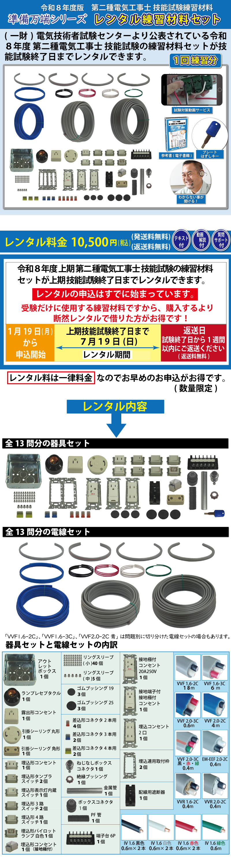 | 製品名 | 【レンタル版】 電気工事士2種 実技 試験セット (1回練習分)令和8年度版【返却日:試験終了後1週間以内にご返送】(発送料・返送料無料) |